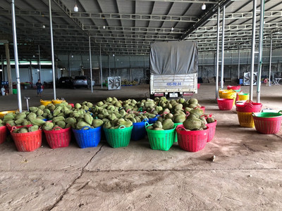 껍질을 벗긴 두리안 조각은 깨끗한 플라스틱 바구니에 담아 바로 포장 구역으로 옮겨 외부 환경과의 접촉을 최소화합니다.
